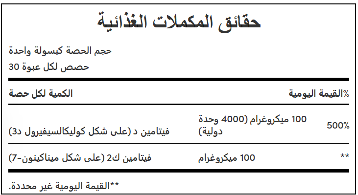 يحتوي على عناصر غذائية أساسية لتغذيتك من الرأس إلى القدمين، مما يُبرز قوتك الداخلية للنمو والازدهار! توفر هذه الكبسولات دعمًا مناعيًا على مدار العام بنفس شكل فيتامين د الذي ينتجه جسمك عند التعرض لأشعة الشمس.* يدعم فيتامين د3 صحة العظام والأسنان والعضلات، بينما يُساعد فيتامين ك2 على صحة الشرايين ويدعم وظيفة فيتامين د3 من خلال تنشيط امتصاص الكالسيوم لعظام قوية.*
